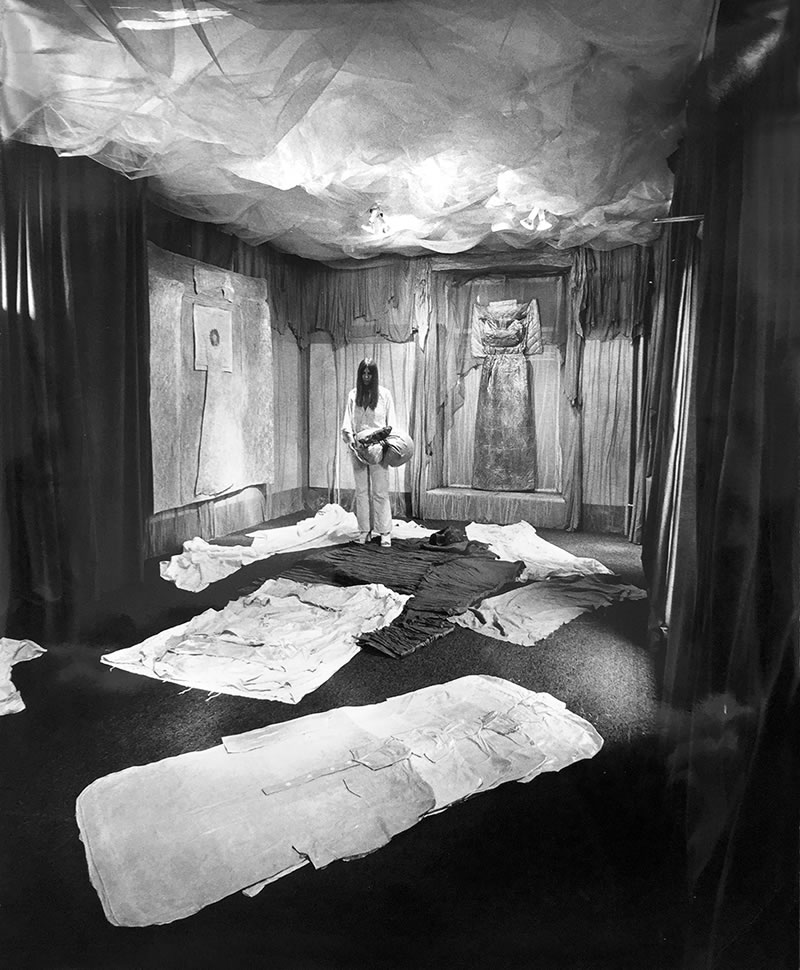 La Herrenzimmer (cabinet ou fumoir) de 1979 est la pierre angulaire de la recherche non seulement parce qu’elle a été étudiée comme la pièce maîtresse au fil des années, mais aussi parce qu’elle offre les clefs de la force symbolique de l’œuvre de l’artiste. Le geste créateur par l’écorchement, la mise en scène des pièces suspendues, les références à la chrysalide et au vêtement mettent en lumière les profondeurs à plusieurs strates de sa mémoire et de son histoire. Ce cabinet illustre à lui seul son détachement de l’autoritarisme paternel et un rapport nouveau à la maison de son enfance.