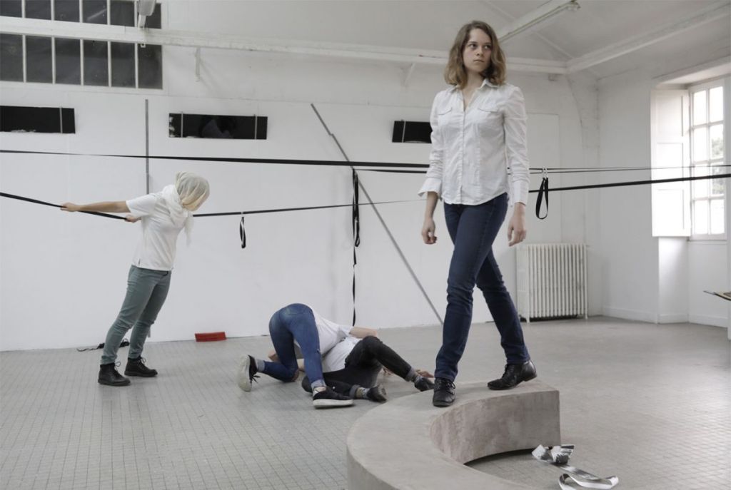 Fanny Gicquel élabore des performances entre geste épuré du quotidien et scène dansée, poétiquement orchestrée, à la manière de Pina Bausch. Les variations de ses gestes se nourrissent des modes de communication non verbale, de la sociologie et notamment du concept d’interaction développé par Ervin Goffman. Sur la base d’actions réciproques, elle élabore un ordre structurel ou ce qu’elle nomme des « conditions d’apparitions » mises en œuvres entre les performeur.euses et les objets. Ces conditions se présentent en une chorégraphie muette rigoureusement pensée et écrite. Les déplacements « entre immobilité et douceur » font apparaître une forme, une image, un motif, une sculpture : « Je considère le temps et l’espace comme une matière que les corps vont venir sculpter », précise-t-elle. Les performances se décomposent alors en des scénettes où le corps, les objets et la gestuelle trouvent un rythme mutuel. Ces éléments rapportés sur un même plan, nous assistons et entrons au cœur d’un tableau vivant. Parfois, les objets s’activent et le corps s’efface derrière le geste. L’idée est de dépasser le format figé d’une exposition et de « montrer que les œuvres ont un potentiel de transformation ».