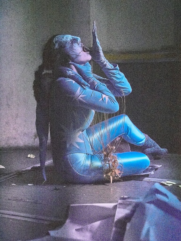 Le.a jeune artiste a aussi recourt à des prothèses en latex pour parfois mystifier encore un peu plus ses personnages ou les rendre plus qu’humains. « Le visuel devra toujours être signifiant par rapport au concept de mon histoire et à ma narration. » En référence à la notion de vallée de l’étrange conceptualisée par Masahiro Mori, Saint Eugène explique qu’iel crée un « personnage souvent souffrant, difforme à la limité de la monstruosité et hyper sensible. Je travaille notamment sur la notion d’hypersensibilité refoulée ». Olivier de Sagazan propose ce type de métamorphoses du corps au sein de ses performances animales où la terre est modelée à même son visage, puis retirée, percée en continue, découvrant ainsi de nouveaux visages énigmatiques. Le côté préfabriqué à la manière de Michel Gondry ou Wes Anderson participe également à transformer la réalité, la disrupter et jouer sur les codes sociaux.