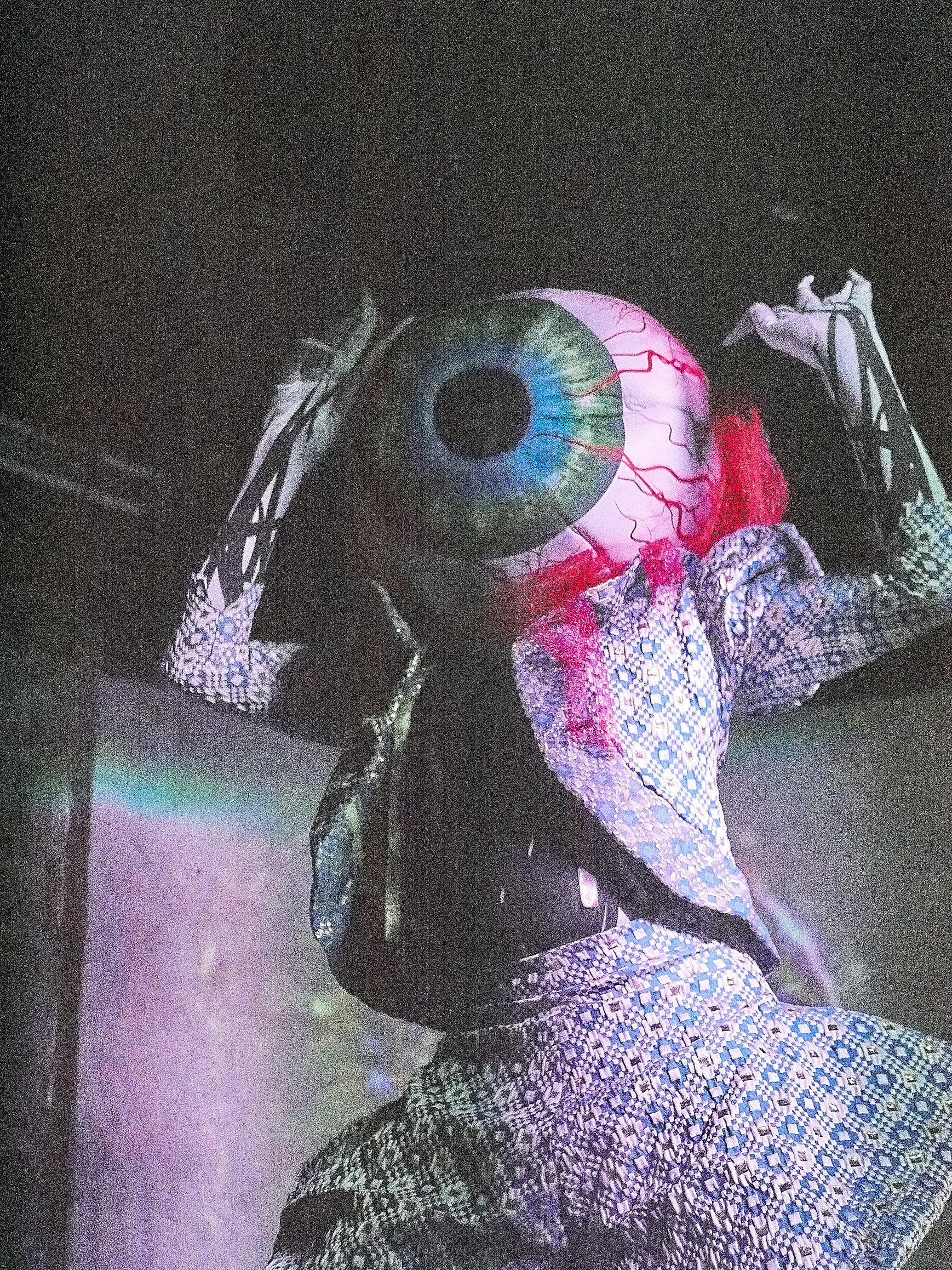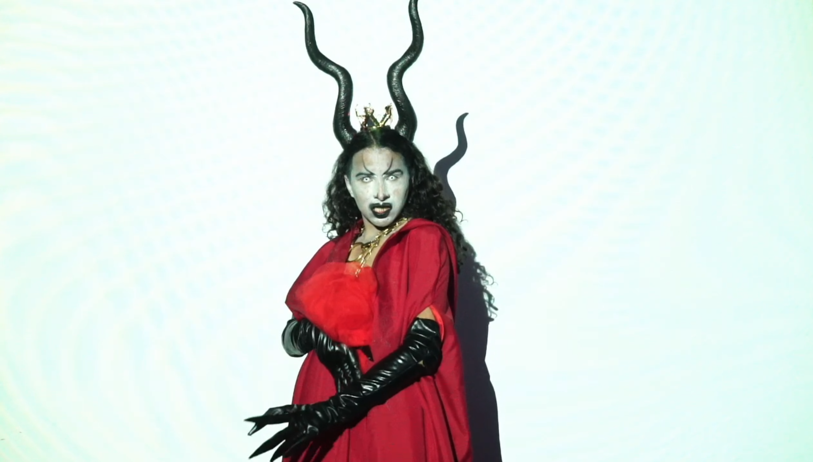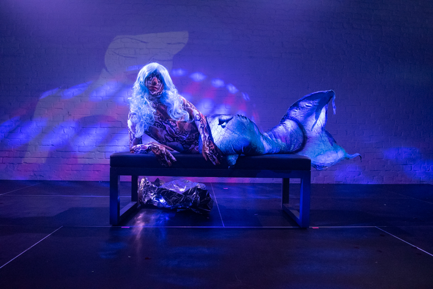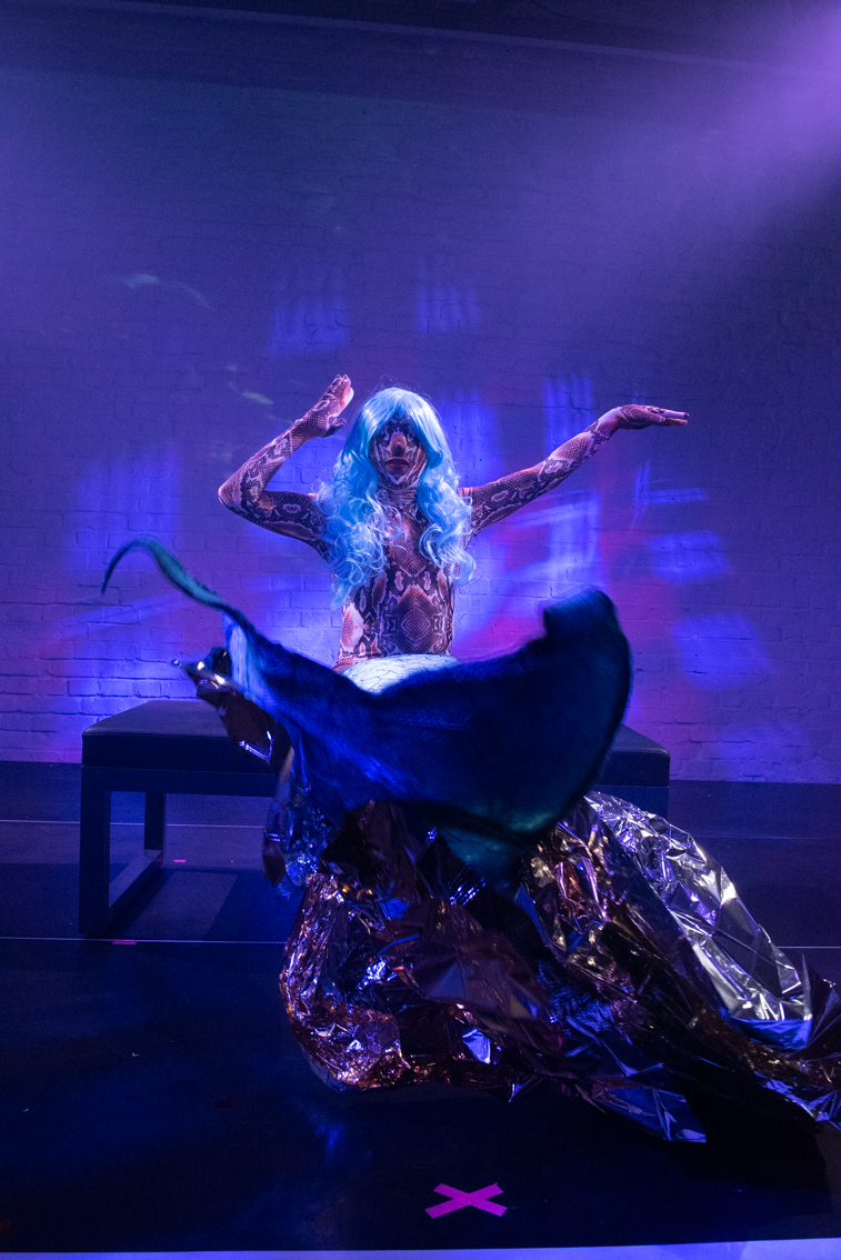 Sasha Kills arrache ses différents habits dans la volonté de brouiller les pistes sur l’identité du personnage présent sur scène : alien, robot, humain, objet ? On entre dans son processus de réflexion à la lumière de sa performance Immaterial qui est un manifeste sur son identité. Elle commence par une phrase en anglais projetée en fond (traduit en français ici): « toute ma vie, je devais me séparer de ma peau, couche après couche, pour finalement réaliser que j’étais un tout depuis toujours. » Sasha Kills parle de son parcours de transition de son cisgenre vers son identité de genre non-binaire. Iel apparaît en sirène, en référence au dessin animé La petite sirène de Disney. Comme elle, l’artiste va se défaire de sa queue de sirène, – passer par une phase de serpent – pour arriver au corps humain qui est aussi une révélation sur soi. Iel passe par les mêmes phases que le personnage : questionnements, doutes et réalisation.