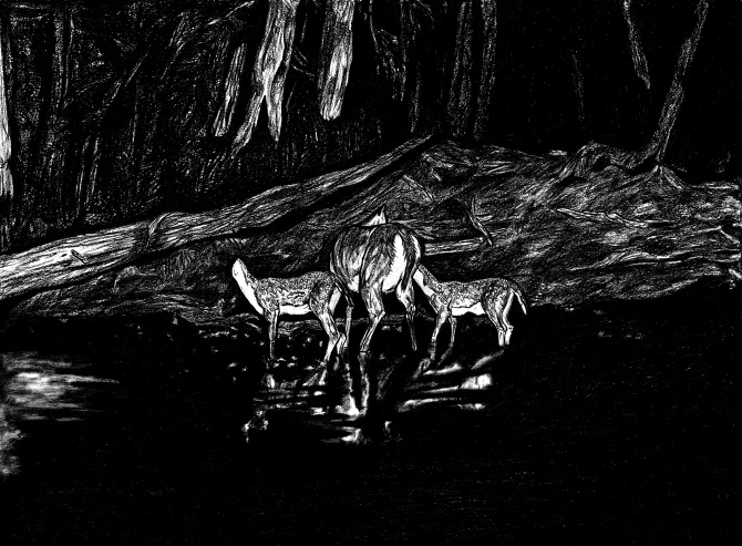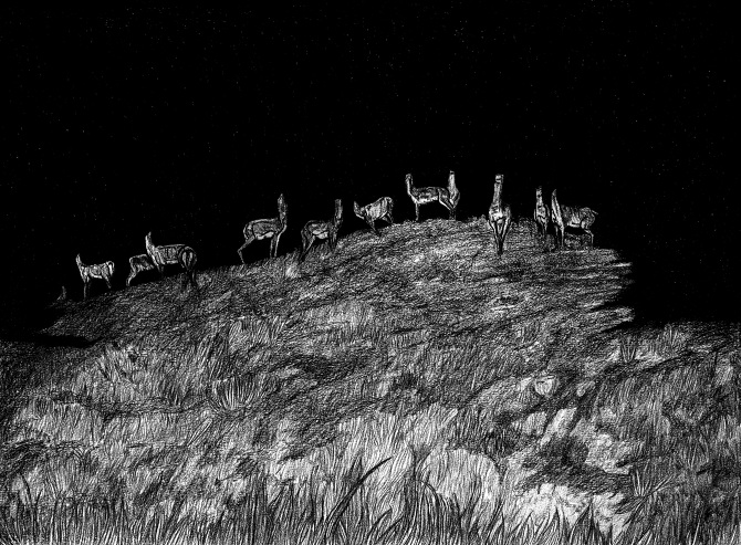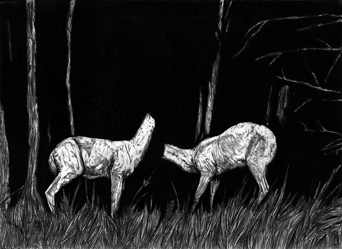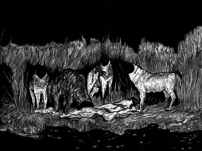 Dès lors, iel n’hésite pas à injecter son identité, ses influences et ses codes dans l’ensemble de son travail. Ses dessins – qu’iel produit sous son nom, Marc Socié – aux créatures surréalistes, sans tête ou hybrides sont des êtres lui apparaissant en vision, que se soit des choses anatomiques et réalistes ou des choses plus fantastiques et imaginaires. Ses chimères proviennent de son goût prononcé pour les formes rares et monstrueuses en regard des « canons classiques visibles partout et reconnaissables ». Iel choisit d’embrasser un trait tortueux et une palette sombre pour des représentations apocalyptiques d’invasions d’insectes ou d’autres illustrations nocturnes d’animaux sauvages sans têtes. Iel est fasciné.e par les formes qu’iel n’a jamais vu induisant le besoin de comprendre comment elle ont été créées. Iel parle même d’une « quête » de l’unicité qui provoque une réaction positive ou repoussante. Cette conception de l’art est proche du Romantisme où le sublime se fond avec le beau et l’effroi. On pense notamment aux Etudes de mains et de pieds de Géricault (1818-1819) qui surprend par le réalisme de ses fragments corporels en cours de décomposition et fascine par sa composition de nature morte macabre. Les compositions inédites de Marc Socié engendrent ces sentiments contradictoires grâce à ses associations du quotidien et de l’horreur. La précision de l’exécution et la fascination pour l’étude scientifique et l’intérieur des choses s’expliquent à travers ses études d’art mais aussi son stage d’illustrateur scientifique au Museum d’histoire naturelle d’Harvard à Boston.