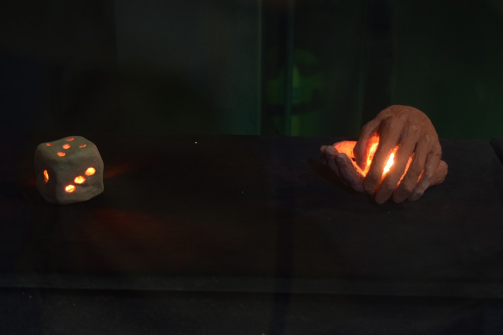 Ce dé tissé aux côtés de la roulette, du jeu de carte, du masque est-il toujours régit par le hasard ? A travers une tranquillité apparente, le jeu étale toutes ses facettes. Soi-même participant.e, nous incarnons des personnages différents pour flouer nos adversaires. C’est un véritable théâtre qui se joue ici. L’image de l’horloge rappelle la patience réclamée après que l’annonce criée du croupier, « rien ne va plus ! », ne soit lancée. Le bulletin de vote plongé dans la roulette, le temps n’est plus qu’attente mais la désillusion est celée depuis le départ. Vous pouvez dors-et-déjà tirer un mouchoir pour essuyer vos larmes. Les tapisseries montrent toutefois un engagement profond et l’espoir d’un tournant. Un sentiment proche du flottement vertigineux de la chaise en équilibre sur la falaise. « Juste avant de tomber », le basculement type du moment critique. Quelle sera la chute ? C’est quitte ou double, alors faites-vos jeux, malgré tout. Une part d’aléas résiste.